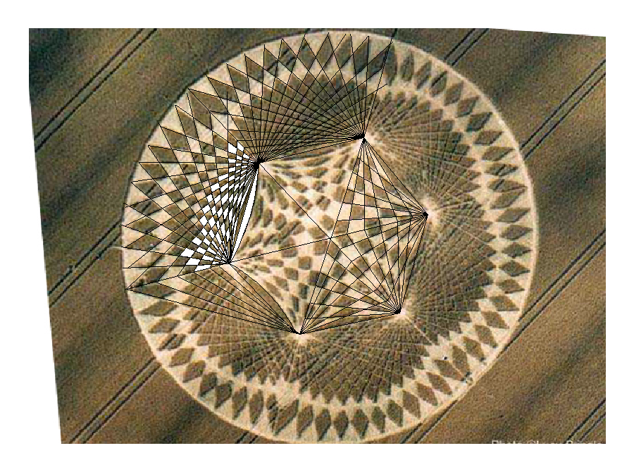 Picture below: Shows a day 2 attempt to 'checkerboard' the segments of the original circle. Note that if it had been completed, (very difficult, since the lines are so closely spaced, and it gets increasingly harder to flatten the long extended segments as they move inwards) the checkerboarding would eventually have to flatten the long segment, which itself adjoins a flattened area. White meets white! Big mistake I think, since they had already formed that segment as a 'standing' segment in the original lay. Although the final result may well have been accepted as visually satisfying by many. Zef Damen's reconstruction certainly looks good, if it had been achievable.. Anyway, they gave up, either because it got too fiddly to flatten those long thin segments, or they realised their error, or maybe they were just interrupted.