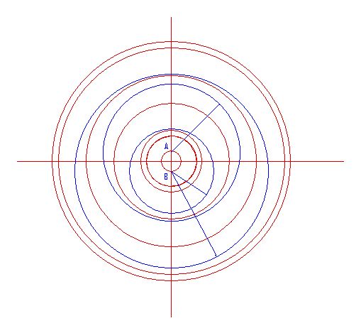 Three blue circles are set out from points A and B which are at the edge of the innermost circle.