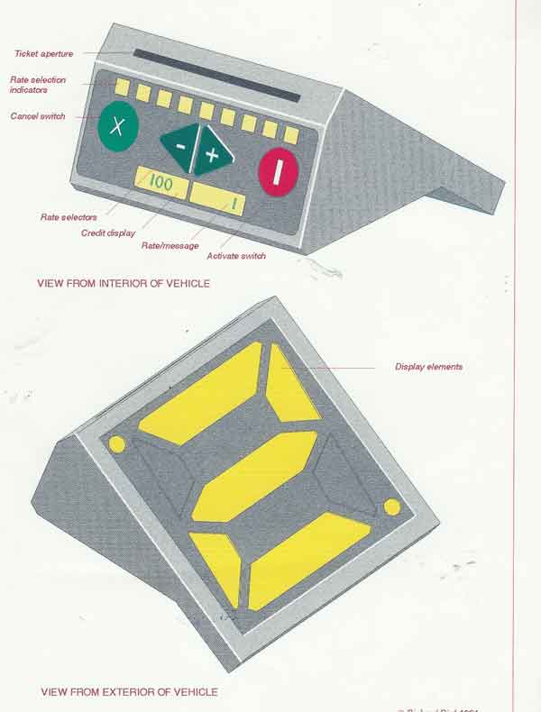 The core of the system was the Unimeter, a self contained 'pay and display' device which is placed in the windscreen of a vehicle. It comprises an external display for monitoring, an interior control panel for the driver, and a slot for a pre-paid charge card or smart card.