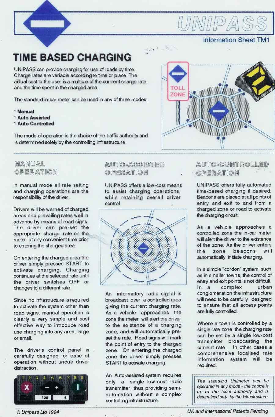 The Unipass road use charging system was conceived and patented by Richard Bird in Cambridge in 1990, and developed further in collaboration with Marcial Echenique & Partners.