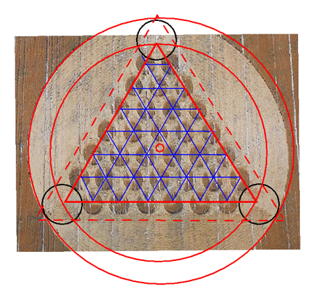 to make: 1. Mark out the inner red circle. Then mark out the red triangle, then the blue lines. Naturally take care not to disturb the standing crop in the circles visibly, or use a drop rod as above. Since the blue lines cross at points it's really