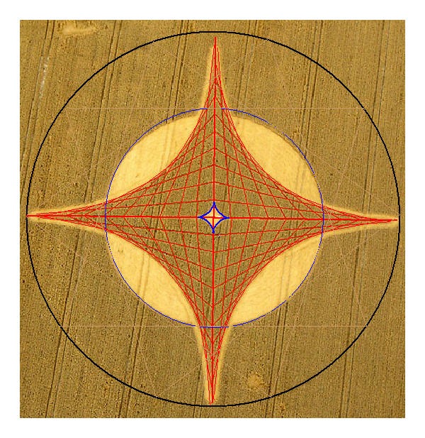 The inner blue circle which is laid in the formation has an approximate relation to the outer circle as a 10 pointed star. (Using the Hawkins' theorem of tangents) This may be coincidence. However there are 10 straight lines on each axis.