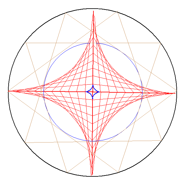 The four main curves of the star are parabolae, formed naturally and therefore unremarkably from the envelope of the 'sliding ladder' sequence of lines, which are all of the same length. The 4 pointed star formation is called an 'Astroid' in geometry. It is a standard geometric construction. See this link for example.