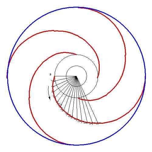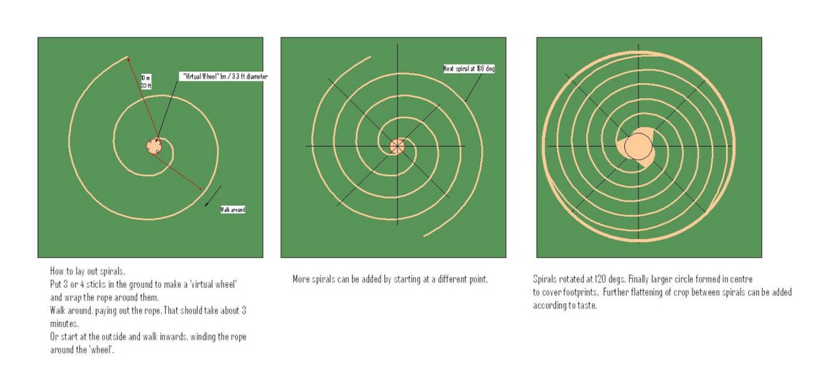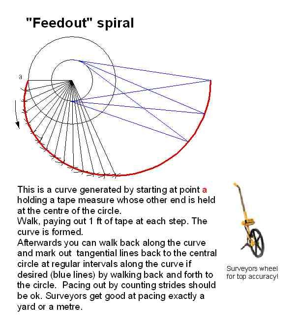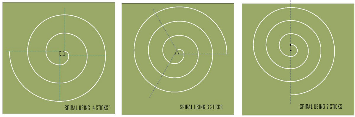 This shows the effect of using 4, 3 or 2 sticks to make the "virtual wheel". In all cases the 'spiral' is actually a series of linked part-circles. The more sticks used, the closer to a pure spiral such as would be obtained using a real wheel. But even 3 sticks gives a good curve which would be hard or impossible to distinguish from aerial photos.