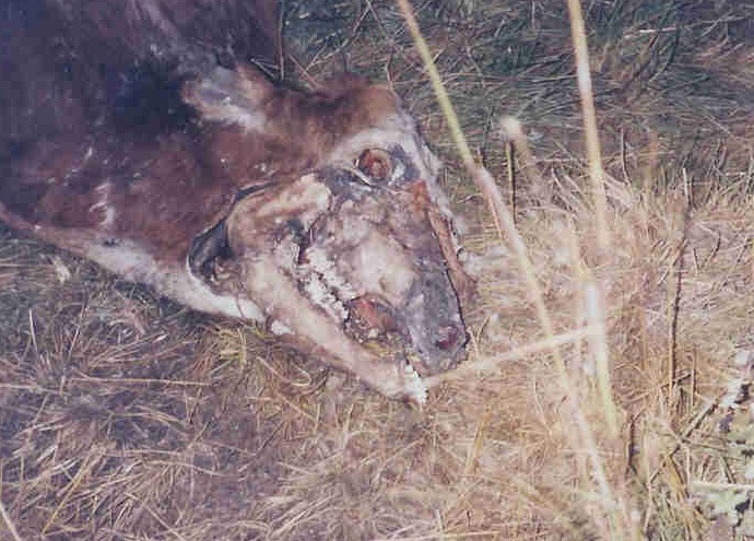 I emailed details of this incident to Nancy Talbott who sounded very interested, and called me from the US to ask about it. She emailed me about similar occurrences in California 1997, which had cattle mutilations over a period of 2 years. Anus cored, the body not approached by predators. The grass around the animal died shortly afterwards, leaving a clear circle around the carcass.