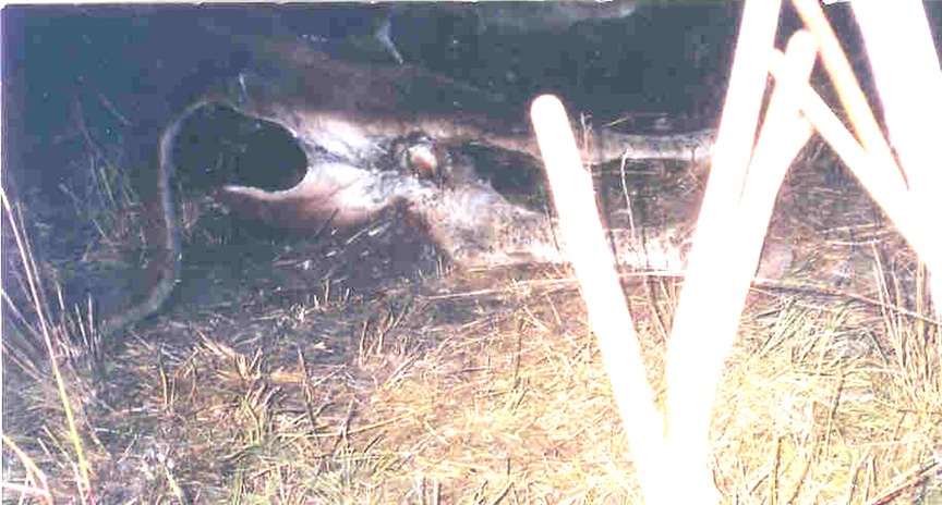 In July 2001 one of her workers found a circle about 4 m diameter in a wild grassland area on the ranch, and a dead cow in the circle, The insides of the cow had been removed entirely, without incisions on the body apart from a neat symmetric cutout around the anus, seen in Photo 1.