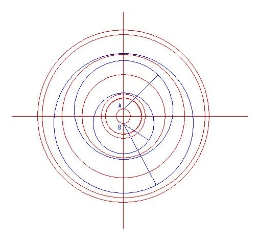 Three blue circles are set out from points A and B which are at the edge of the innermost circle.