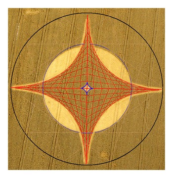 The inner blue circle which is laid in the formation has an approximate relation to the outer circle as a 10 pointed star. (Using the Hawkins' theorem of tangents) This may be coincidence. However there are 10 straight lines on each axis.