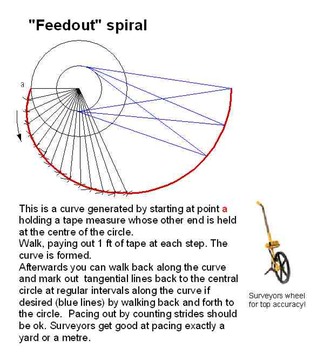 This shows the effect of using 4, 3 or 2 sticks to make the "virtual wheel". In all cases the 'spiral' is actually a series of linked part-circles. The more sticks used, the closer to a pure spiral such as would be obtained using a real wheel. But even 3 sticks gives a good curve which would be hard or impossible to distinguish from aerial photos.