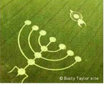 "This formation appeared at Barbury Castle in 1999. The makers display a very special knowledge of Judaism and in particular of the history of the Menorah. I invite forum readers (and especially the human makers if they are following this) to say what I am referring to. In order to retain secrecy in this 'quiz' and to be able to correctly attribute answers, I invite readers to use the private message facility to mail me [anonymously] with their comments. This is not just a quiz for amusement, it is a bit of serious research. "
